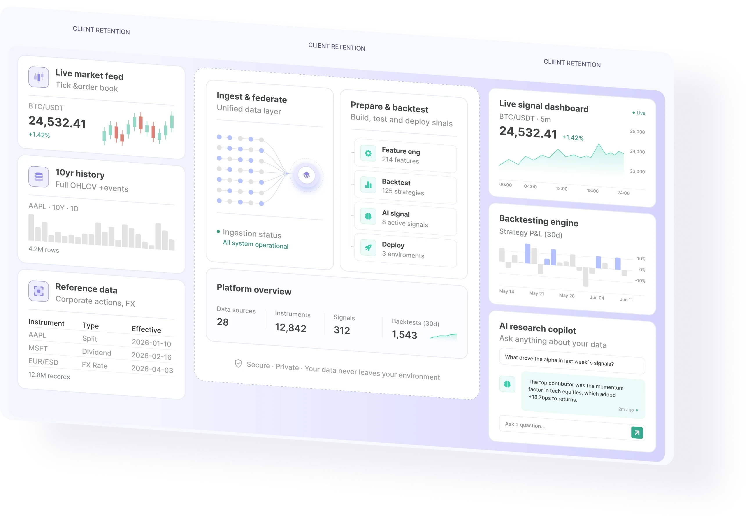 Empower your clients a plug-and-play environment to ingest, prepare, backtest, and visualise signals — all within their own cloud, with zero data or IP exposure.